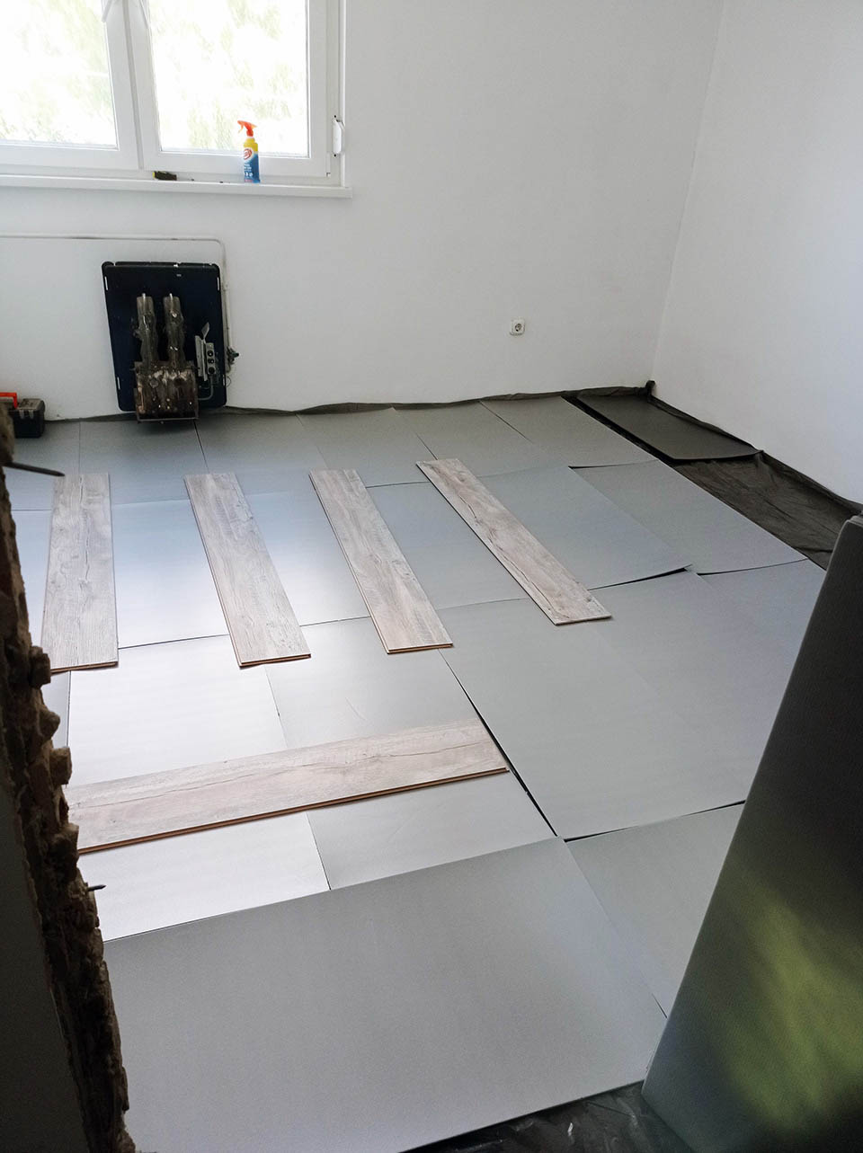 Egy kis felülettisztítás és vakarózás után tehát jöhetett is a párazáró fólia, majd a lépészaj-csökkentő alátét, végül az áhított laminált padló, és utol is értük Nyugat-Európát.